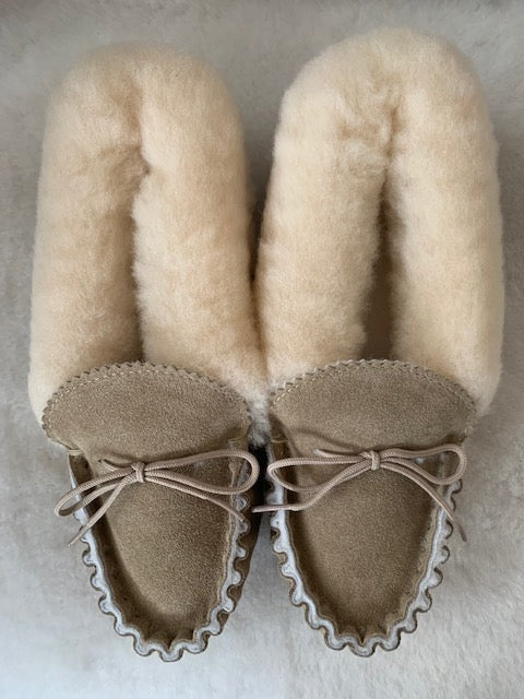 Ladies traditional moccasin made from top quality English suede upper with luxurious sheepskin lining and an extra deep snug sheepskin collar with adjustable lace and soft suede sole.