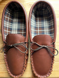 Gents leather moccasin shoe design made with top quality in Nutmeg & Black leather with tartan lining adjustable lace and PVC sole.